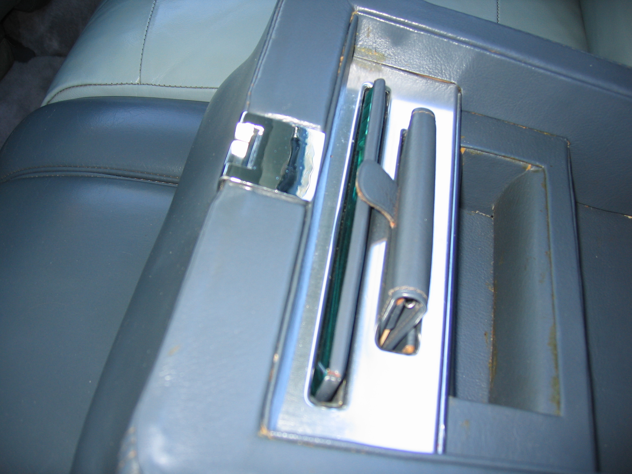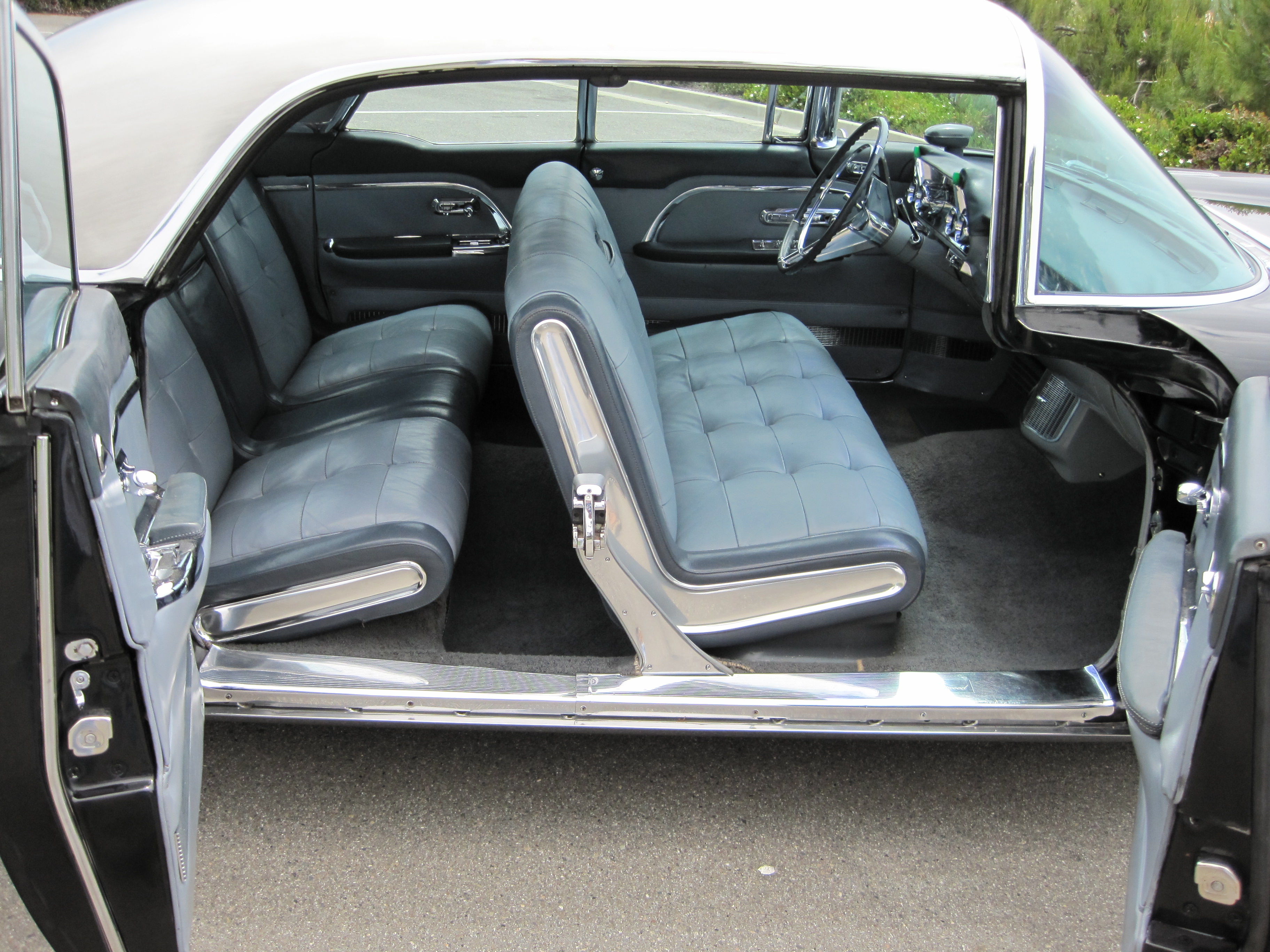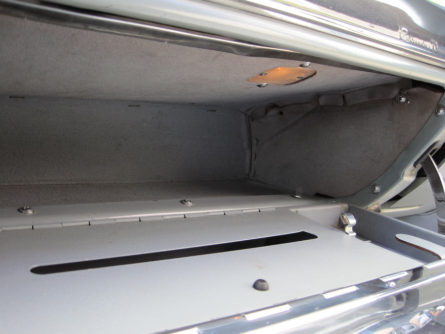 The interior of this car is simply spectacular! You just can't believe that it is completely original. I removed the front seat bottom and had it disassembled so that the stitching could be refreshed. Original nylon "Karakul" carpet is excellent however I did need to sew in a larger heel pad because of wear adjacent to original. Dash pad shows normal foam breakdown and heat shrinkage (Just Dashes can replace). All windows and vent windows work well. Central locking, gear shifter lockout and rear door disable all works. Polarized sun visors are spectacular and perfect! Trunk open/close control works fine. Interior ceiling light bezels are uncracked and not heat distressed. Emergency brake works fine as does toe operated release button. Horn is inoperative but proper Eldorado Brougham horns are all there (4 of them!). Trunk material was "shot" and reproduction carpet for the 1958 year Brougham is not available. A beautiful, professionally done reupholster of the trunk was done in a color and weave very similar to the 1958 material (1957 material is made but not correct). Jack items and wood wheel block are intact. Trunk open/close works great as does the trunk light.